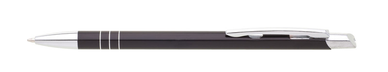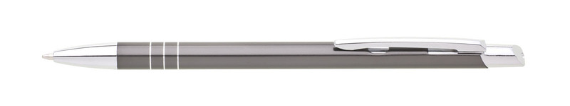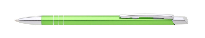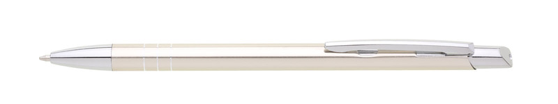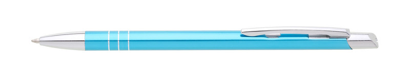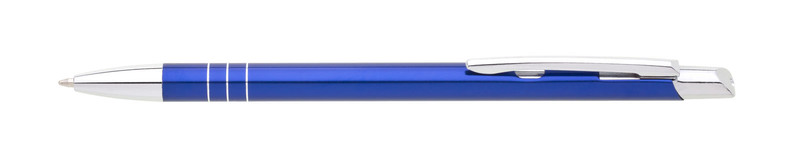 Tenká kovová propiska SOTTI v barvě s chromovými doplňky a třemi tenkými proužky. Náplň X-20, modře píšící.