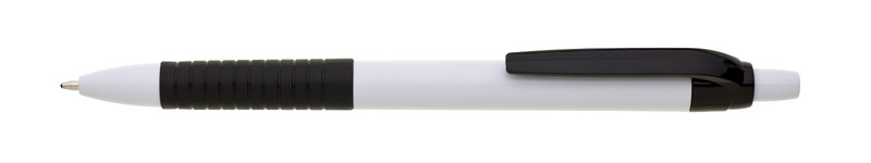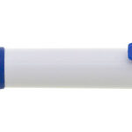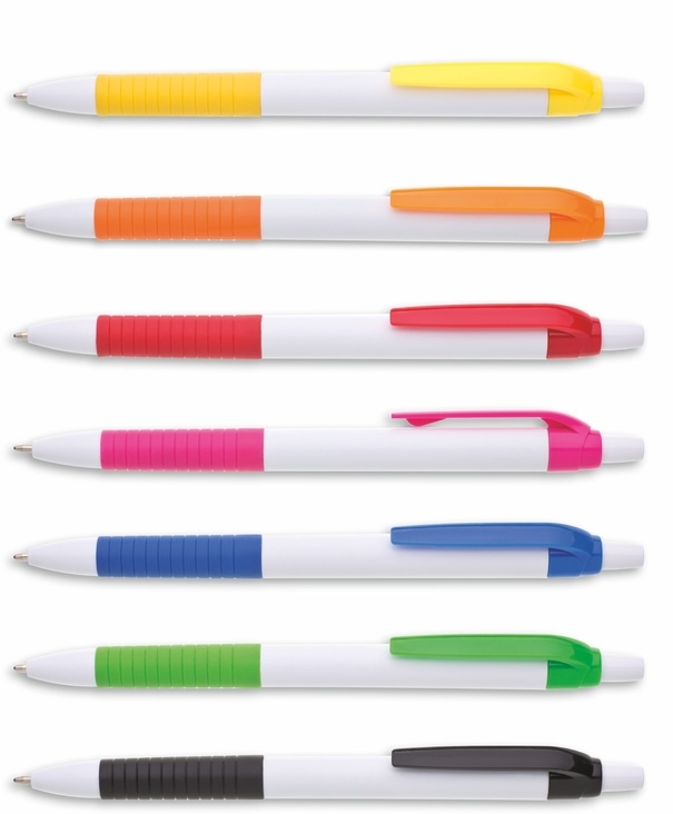 Propiska s bílým tělem, barevným gripem a klipem, náplň modře píšící.