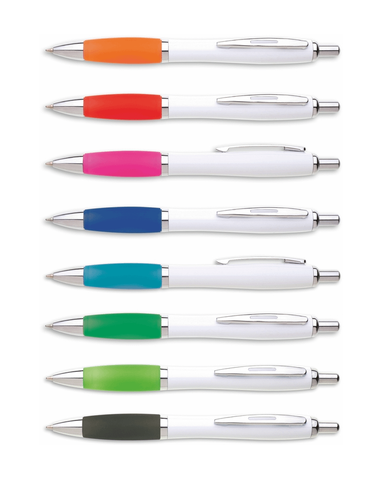 Plastové propisovací pero JESI s bílým tělem. Barva pogumovaného úchopu je barevná. Ostatní doplňky jsou stříbrné. Náplň je velkoobsahová modře píšící.
