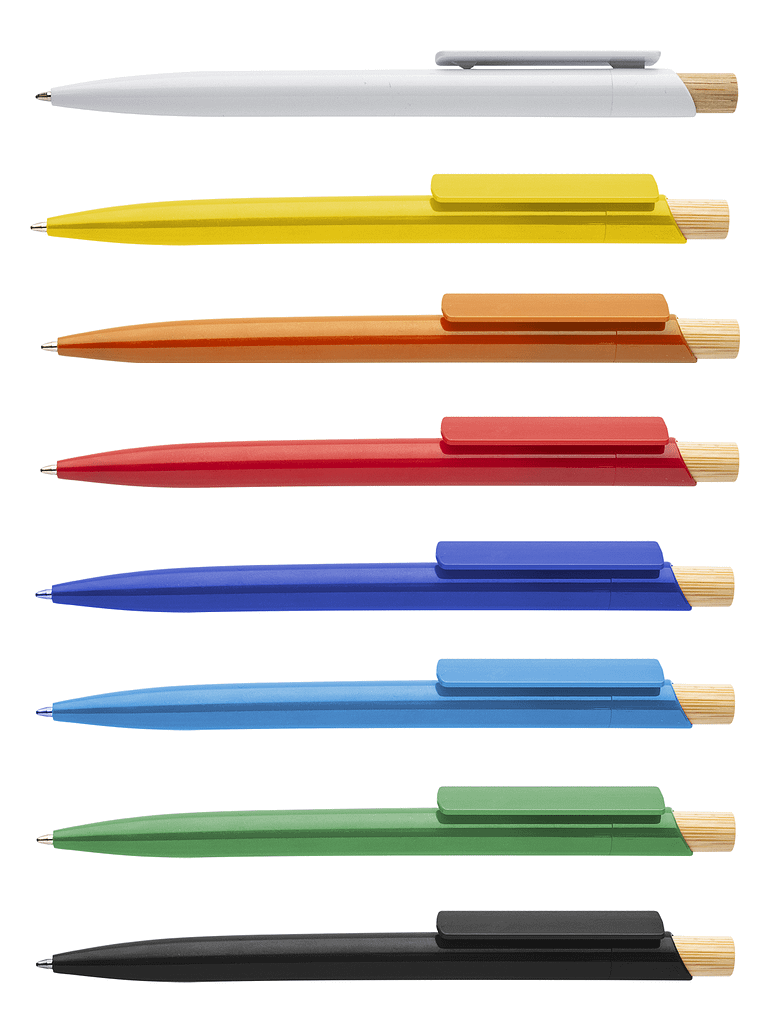 Kuličkové pero z recyklovaného ABS plastu s bambusovým tlačítkem. S modrou náplní.